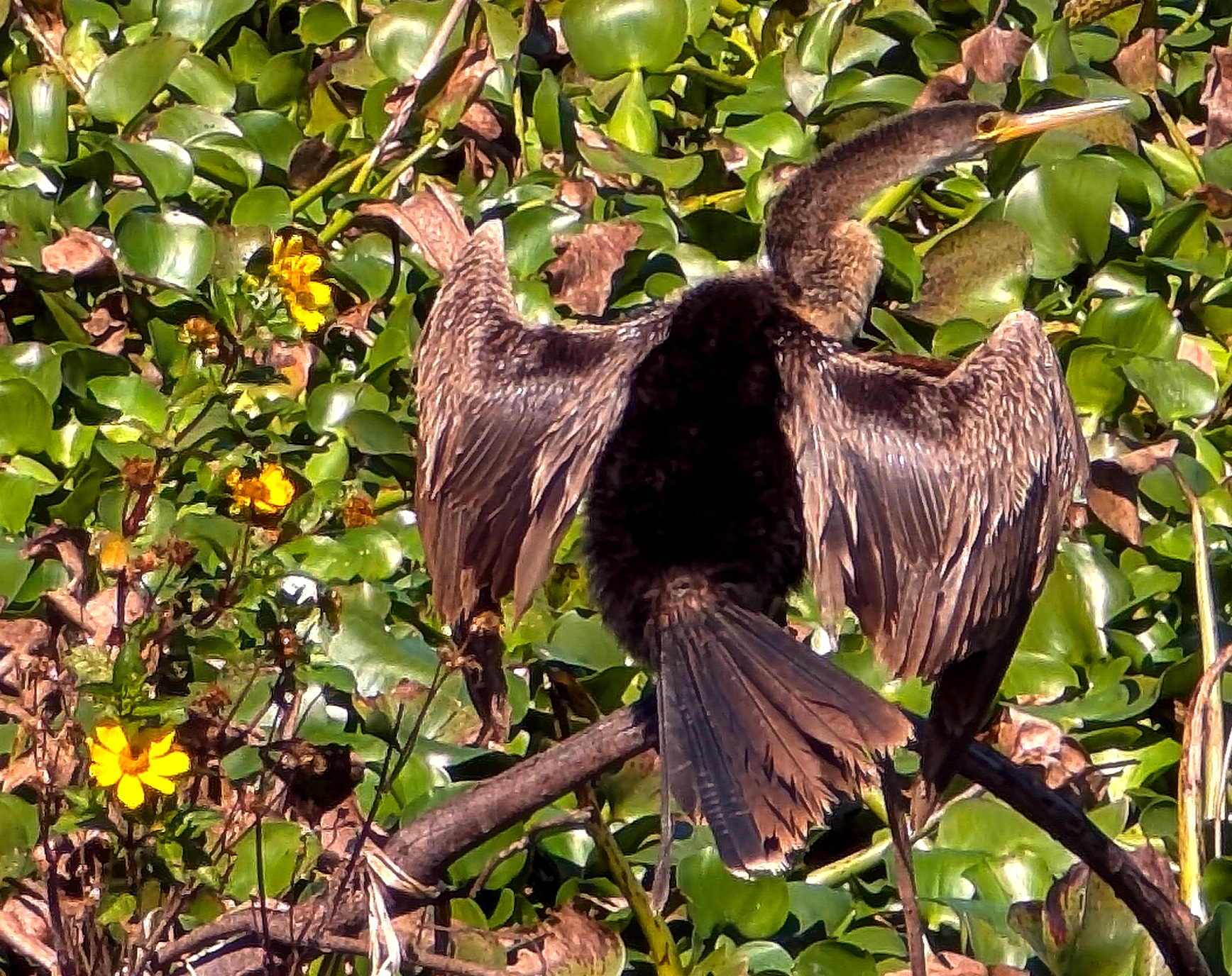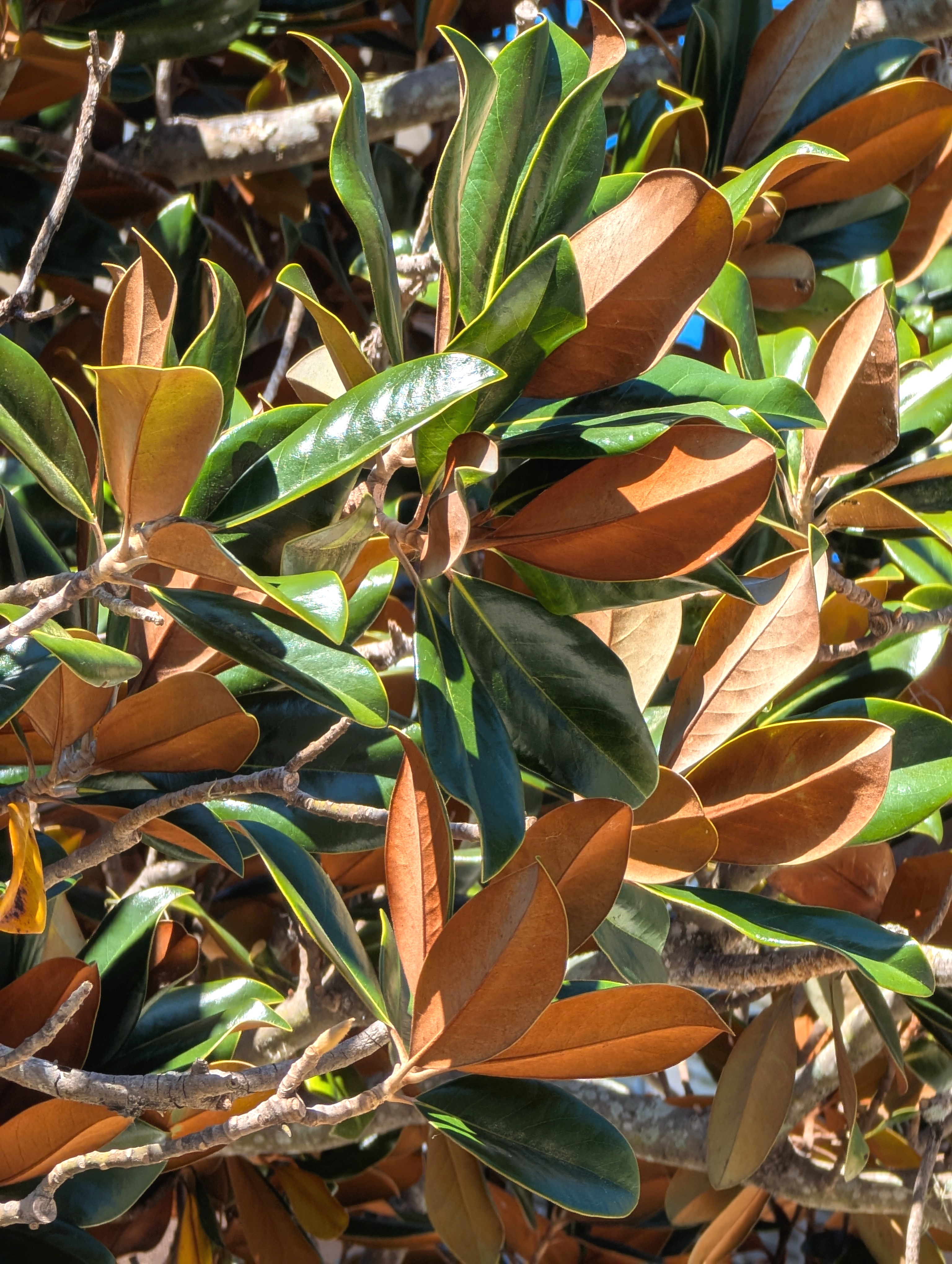 Last October we paid to have our back yard replanted with plants native to North Carolina, the American Southeast, and the Atlantic seaboard. As in colder climes, the vast majority of native plants drop their leaves and enter dormancy for the colder winter months. We also “leave the leaves” which allows them to decompose into the soil as they should, creates cover for the little creatures to stay warm (and avoid hawks), and supports the lives of little bugs which in turn provide food for the ground-feeding birds. Thus, the predominant color of our back yard and our front yard is brown.