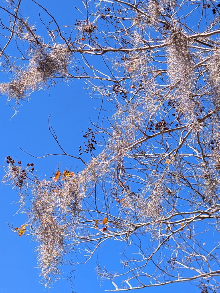 Our neighbor’s yard represents most yards around us. The green of English ivy covers the ground and the trunks of the trees. Saplings of non-natives take advantage of the warmer winter weather much as sunbirds head for Arizona or the coast of the Gulf of Mexico. Some keep their summer foliage—no need to drop leaves and protect a plant conditioned to far colder climes. It’s not that leaves fall only in our yard; there’s an oak or two and some poplars over there. It’s that the ivy manages to conceal somewhat the leaves in my neighbor’s yard.