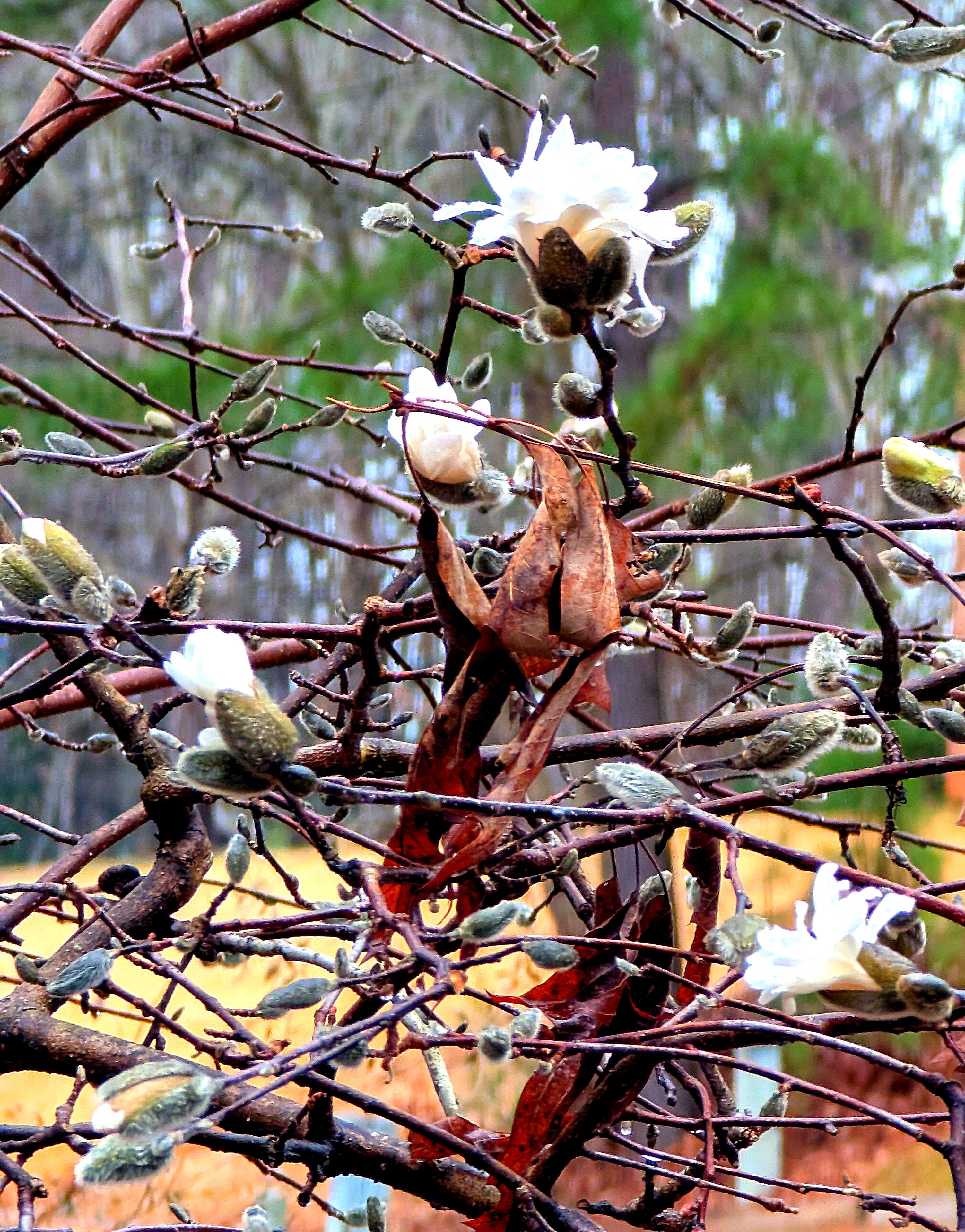 I had thought our late February vacation would preclude being greeted by the first bloomer of the spring, the star magnolia, but no! She bloomed between the 18th and 20th this year, at least with a few of the blossoms toward the top. I will still miss the entire shaggy mass, but the past couple years the ravenous squirrels eat more than half the blossoms before they “hatch”.