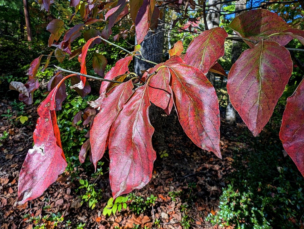 This is what all of the dogwoods on the property look like. We have six or eight. If they aren’t this red, they’re a mix of dusky red and green. Some trees around us are a bit further along…