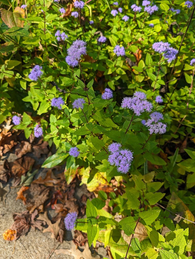 Chrysanthemums aren’t the only fall flowers. The above is blue mistflower and blooms somewhere around Labor Day. It stays beautiful until a really good frost hits. Fortunately, that shouldn’t happen for at least a week, so we’ll usher in November with these lovelies still blooming. They’re ‘volunteers’ as near as I can figure: they don’t look as if they were planted because they grow in several of our flower beds. The ones above appear along the walk to our front door, appearing when I most lament the end of the purple coneflowers.