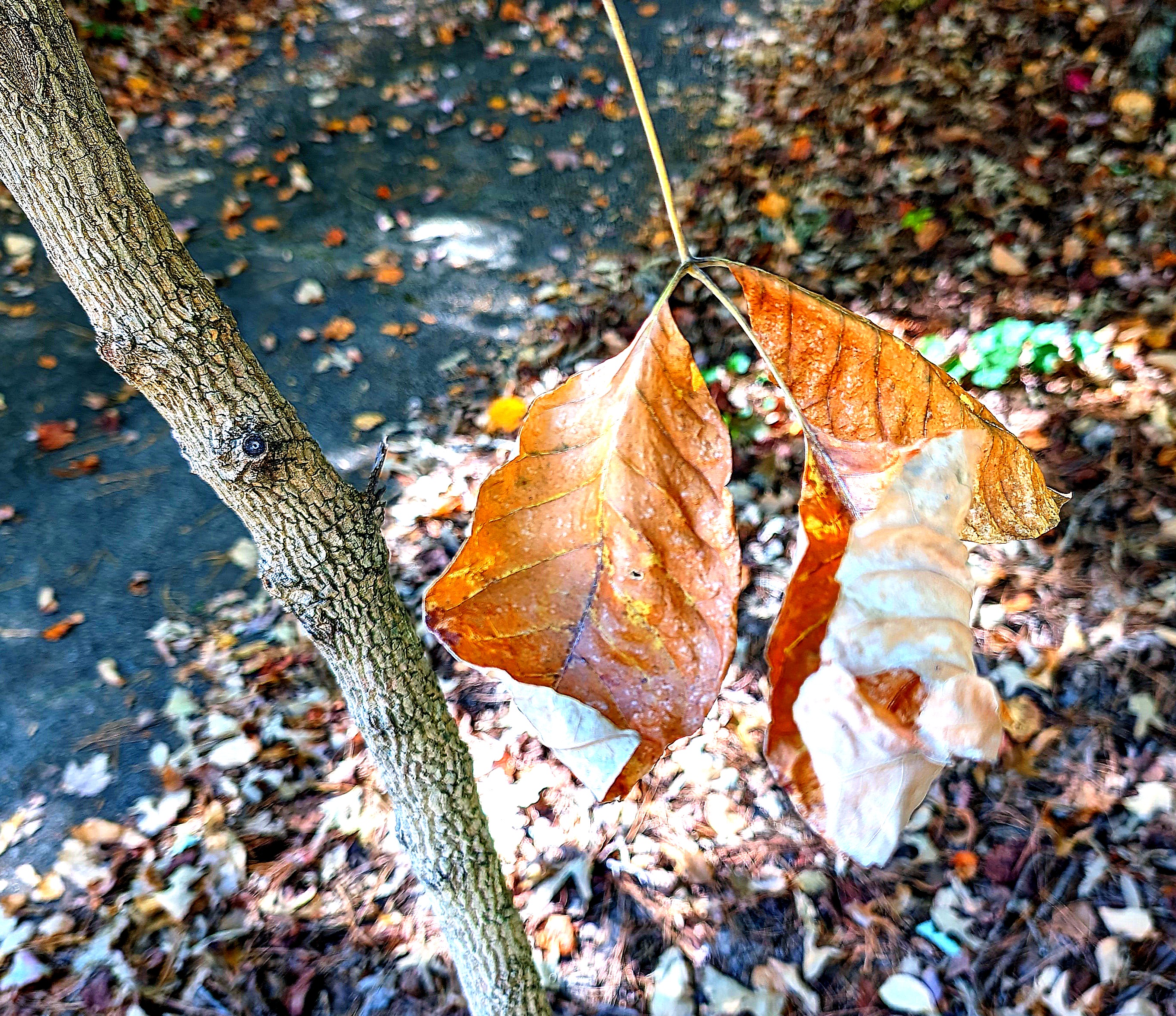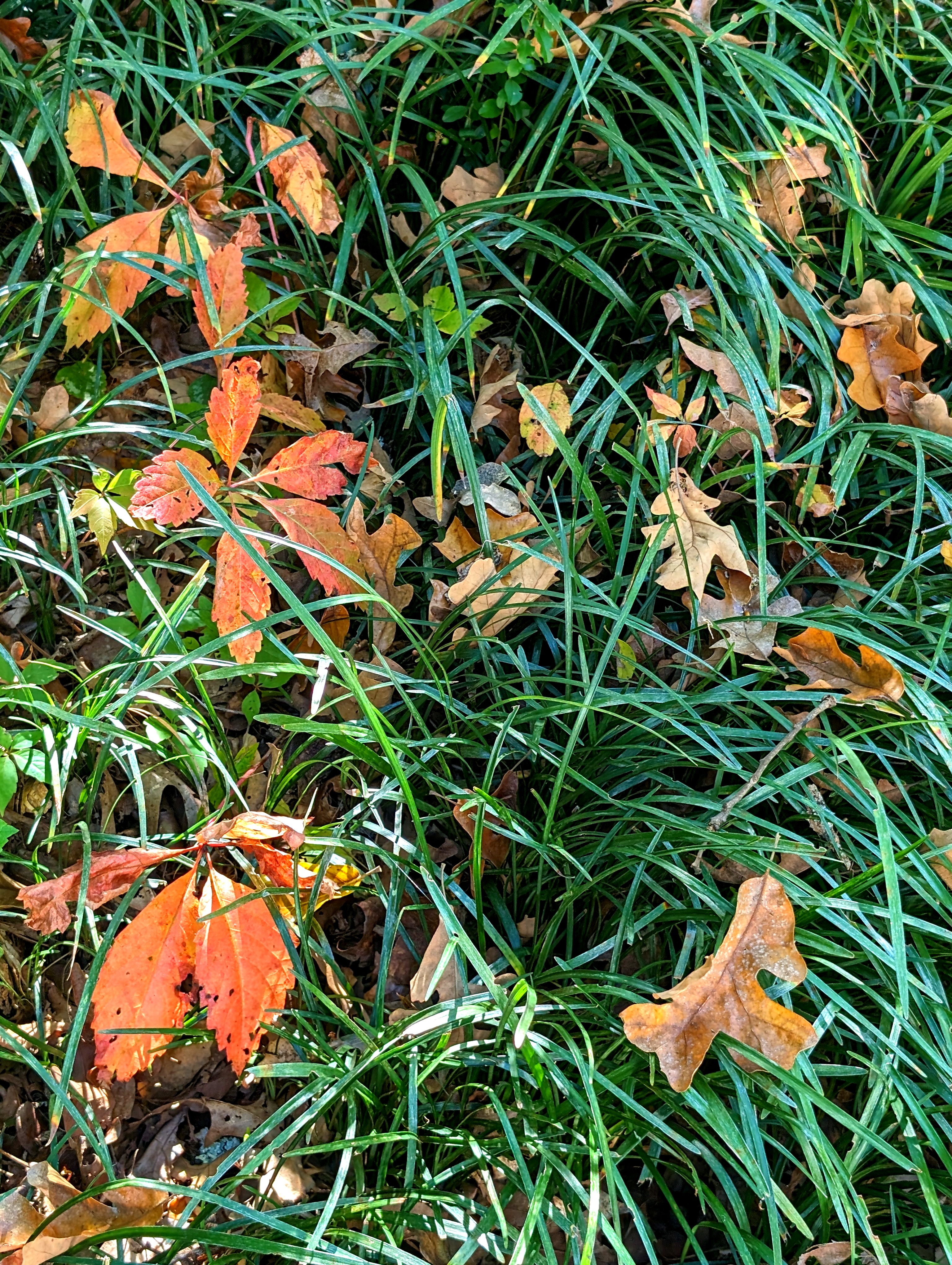To give y’all perspective, about 75% of all leaves are still green. I know, this is different than Up North. The 2nd weekend of October always had the reputation for being the peak of leaf-peeping season when I lived in New York near the Massachusetts border. Here…it’s a little different. In the above photo, the two tallest trees which stand in front of the others, are two tulip poplars in our backyard. (The house roofline is visible at the bottom of the photo.) The one on the left is exposed more with no tall trees immediately around it. It starts dropping a few leaves in late July or early August because our heat stresses it (I guess). It starts dropping leaves before anything else, and at this point is 75% bare. The tree on the right sits further back, and is protected more as a result. It’s just now taken a decidedly yellow tone with most of its leaves. As you can see, many of the trees remain green. At the bottom of the photo are the upper branches of a dogwood. Not all of the trees remain in a green state, though….