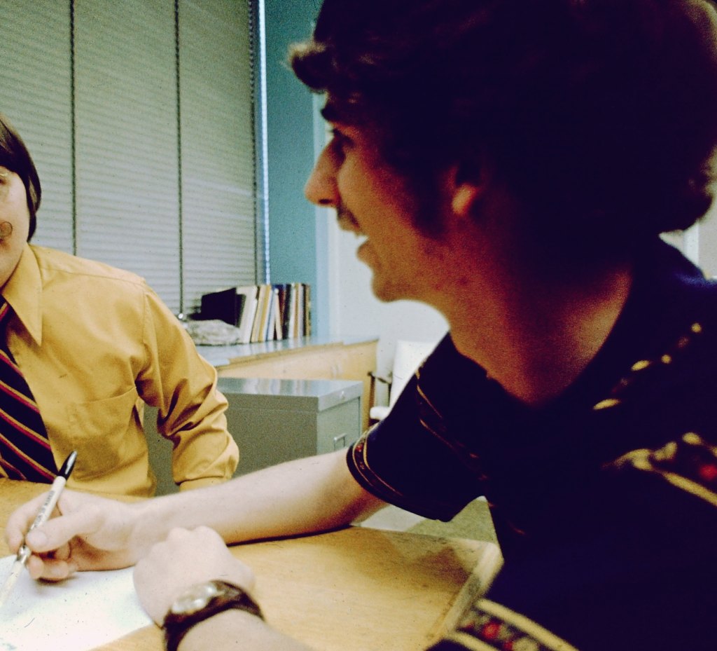This is a photo of my journalism teacher at the beginning of my junior year, except I don’t have permission to use his photograph, so you’ll have to imagine a guy that looks a bit like Dickie Smothers complete with a curly-ended handlebar mustache and a page-boy haircut. The photo was taken for some kind of promo thing for the yearbook company. He left us at the end of that academic year to go teach cinema studies in Edina, MN. I stayed, dithered, took journalism, veered to creative writing, and wound up doing neither when I went to college at the end of 1972. Ah well.