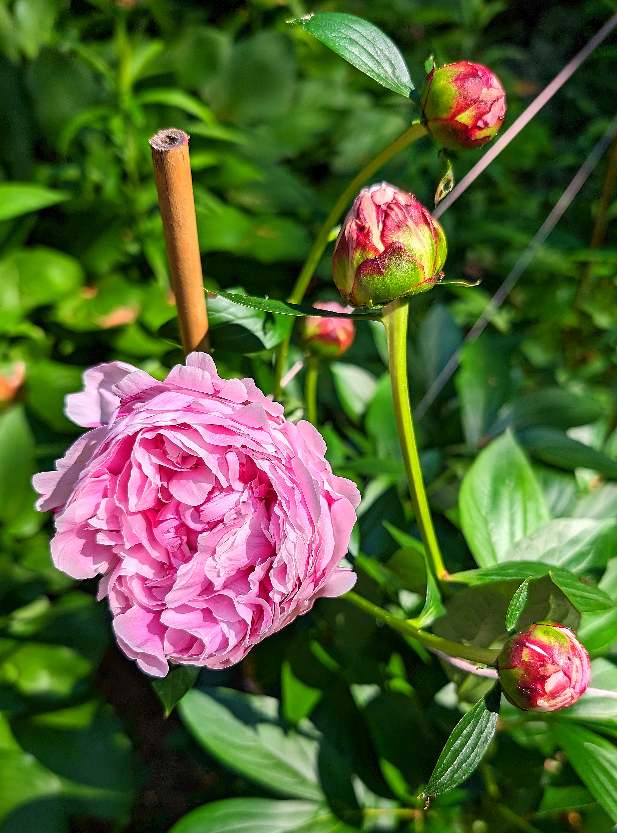 Symbolically, this peony represents why I haven’t been posting. It’s two days ago, I’ve got about 30-45 extra minutes in the late afternoon, and I think, “Hey, I better get that peony tied up before it blooms, and for sure before those hard rains hit that are forecast for tonight.” My two peonies will fall right to the ground as soon as they bloom fully. The rain didn’t materialize, but this photo, taken yesterday, shows many blooms are on their way and it’s supposed to rain tomorrow “for sure” and…you get the idea. The idea that I could instead get something posted never entered my mind.