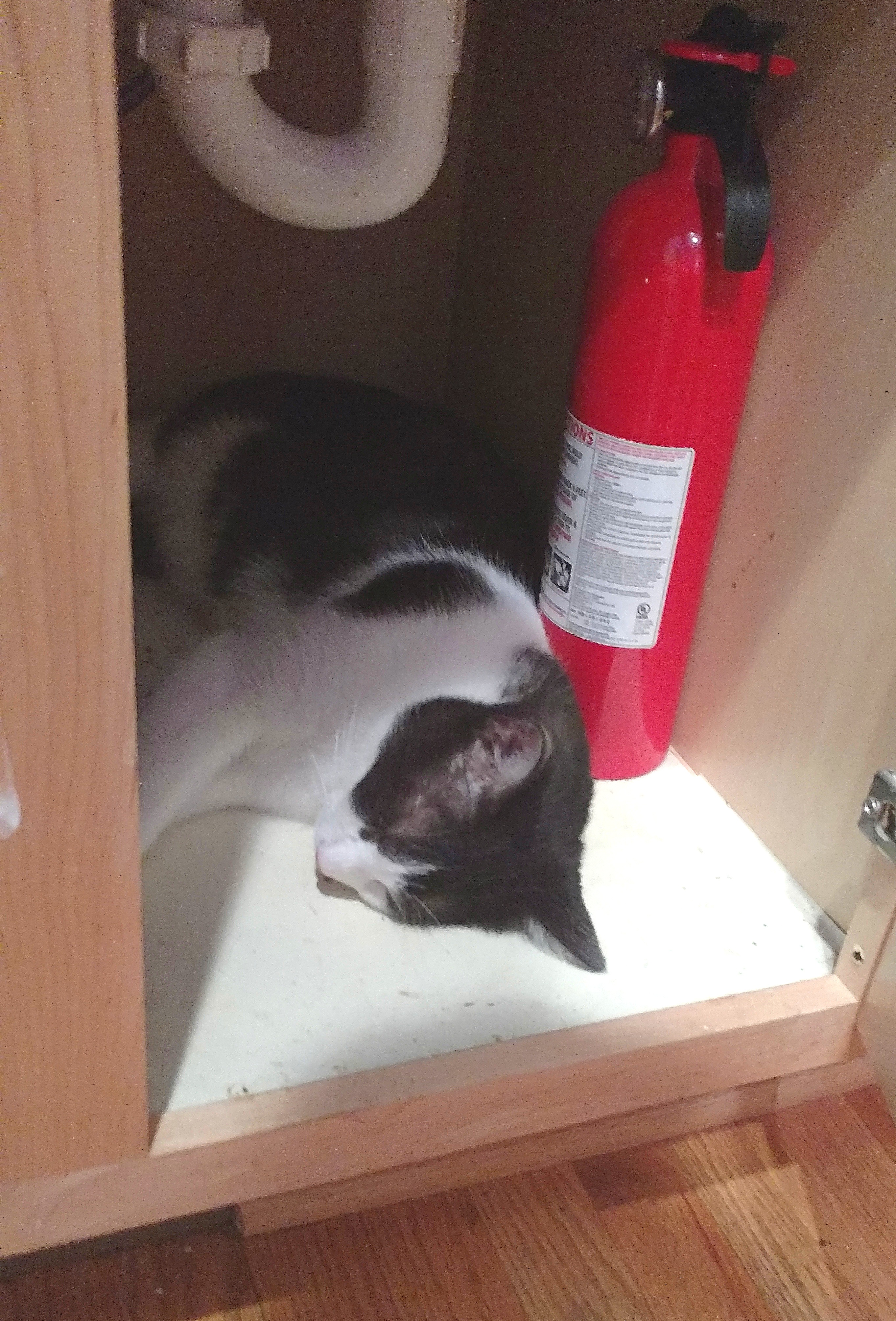 Charlie got very stressed. First he hid under the kitchen sink. Then he climbed on top of the cupboards and stared at us and panted.