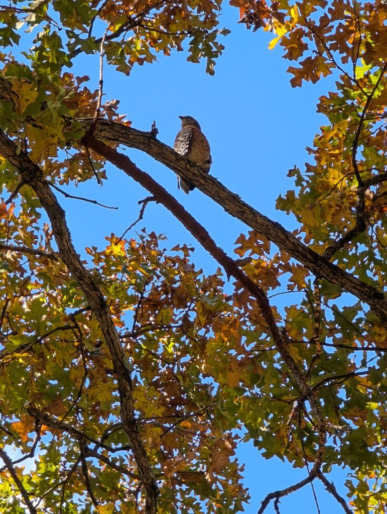 While meeting with a representative from the company which recently installed a natural front yard for us, we watched a red-shouldered hawk sitting in our white oak tree. It sat there five minutes, flew a small circle through the neighbor’s trees, and returned for another ten minutes. Unlike my usual luck–it flew that circle just as I returned with my phone–after it returned, it remained there so long I grabbed a half dozen photos, finished with the landscape rep, ran downstairs for my 50x zoom, and captured another couple shots on that camera. I’ve yet to download it.