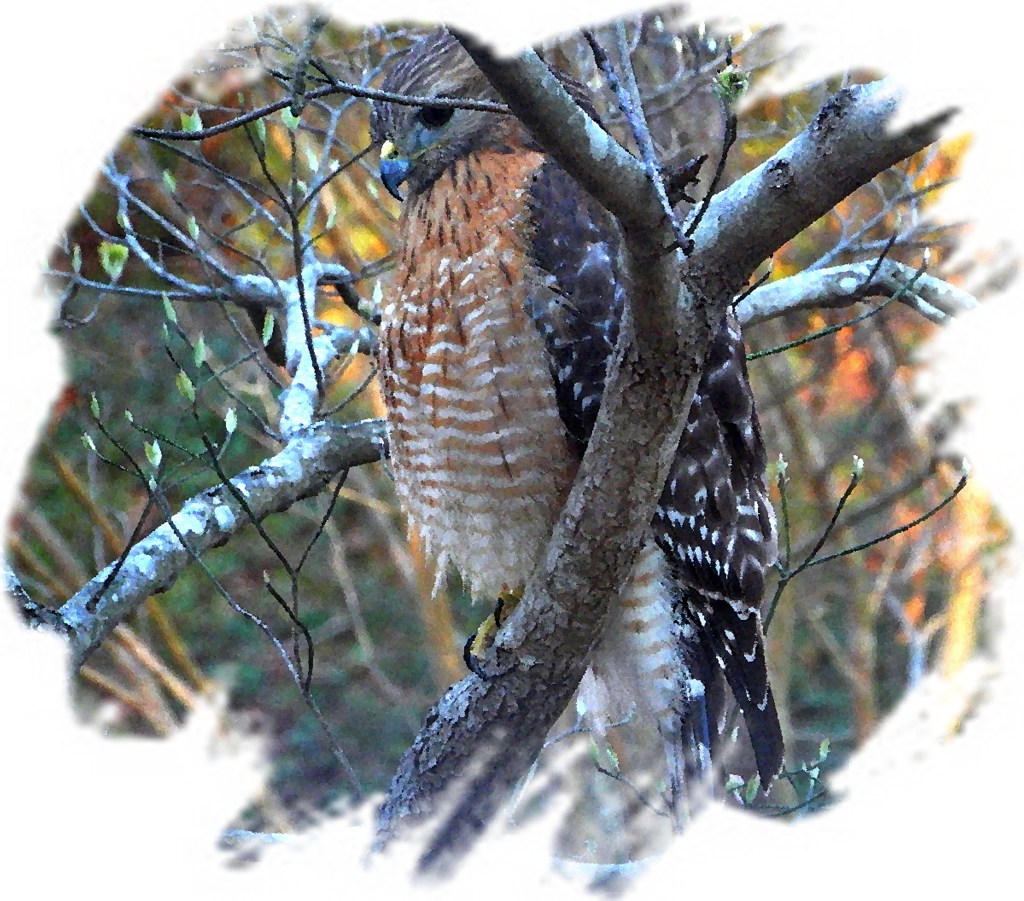 Five days ago this red-shouldered hawk sat in our front yard dogwood, just ten feet or so outside our kitchen window. For a few minutes it surveyed the landscape. Upon finding nothing to eat, it swooshed off. March 2025.