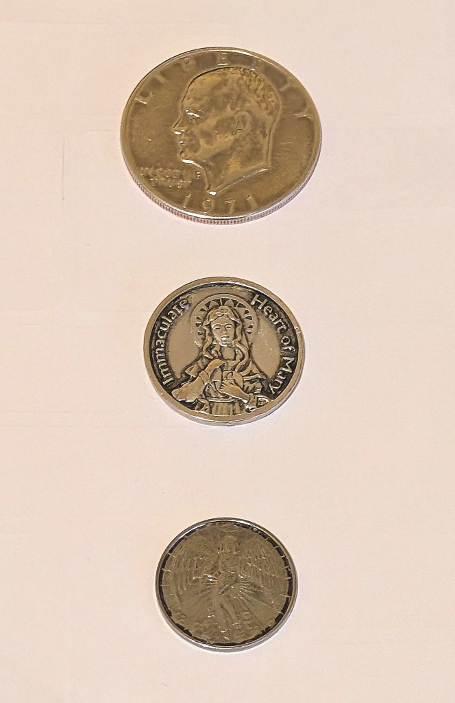 My final coin (because it’s biggest) reminds of something far less religious, but no less meaningful. My father had an eclectic collection of coins he kept in a small metal box shaped and decorated as a 1940’s suitcase complete with travel stickers on it. He popped the occasional coin into it which he thought would be “worth something someday” or just out of curiosity. The U.S. Mint first struck an Eisenhower dollar in 1971 which likely explains why my father set this one aside. It also happened to be the first dollar coin minted since 1935. To me, however, it stands in for my father. I grab that coin and think about the oddity of putting 15-20 coins in a little kid’s bank and then doing nothing with it: he never took them out and looked at them, he never spoke about them, nothing. Only when he allowed my brother and me to dig around in his chest of drawers would we get to see what this little metal box held. In a larger sense, I see that profile of a bald president and think about my father in his final 20 years. I say a little prayer that he has found peace in the afterlife, a peace which eluded him here.