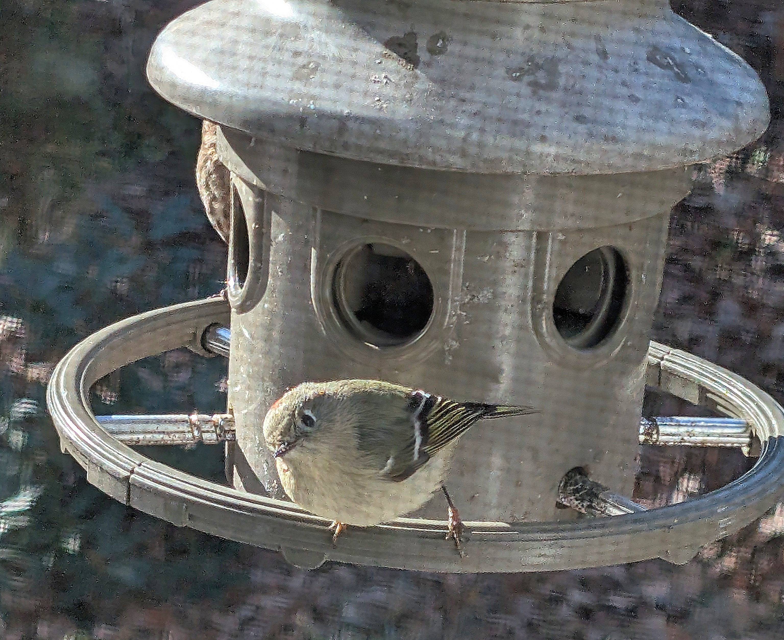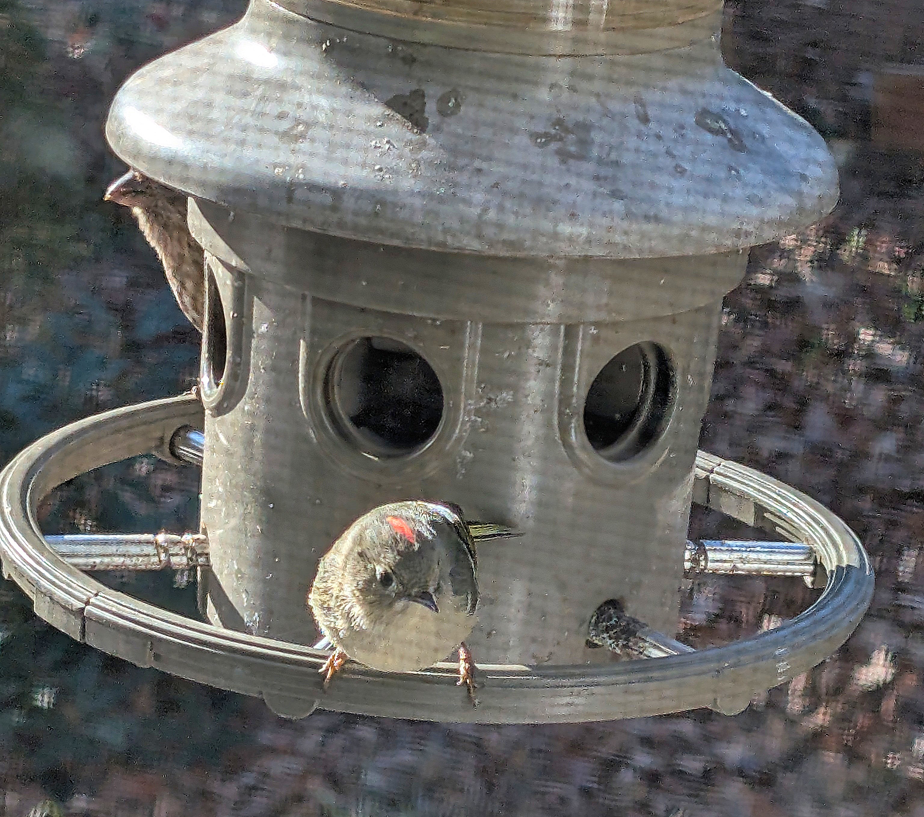 I finally identified a little bird this morning which had been zipping all around our feeder while ignoring it all the same. He mostly seemed interested in getting into our kitchen. The cool thing about him is the crown: when a bit agitated, he flips it up as it is in the photo above. When he’s calmer, it’s down and more difficult to see, as shown below.