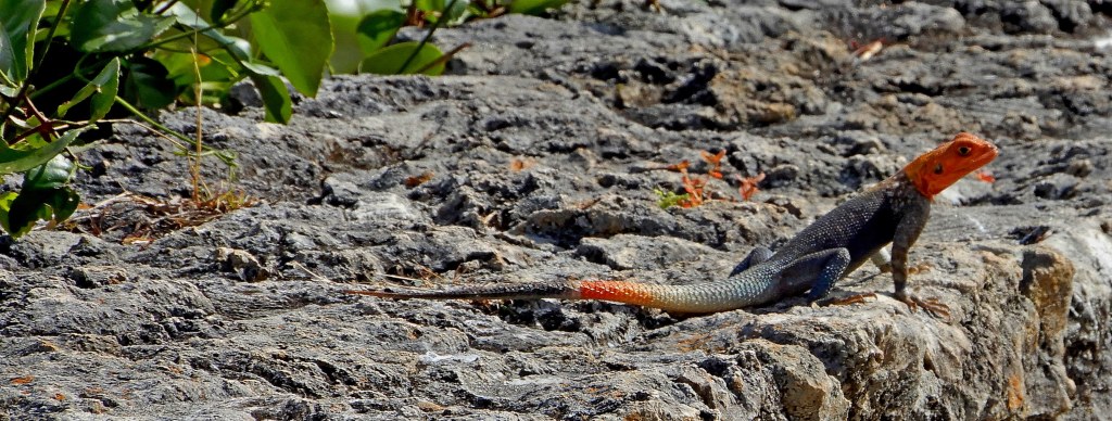 Sadly, the photo above shows a gorgeous male Peters’s Rock Agama. Sad because it’s an invasive species from Africa that’s out-competing local lizards. Yes, there are two S’s because it’s named after a biologist named Peters. He’s perched atop a rock wall bordering the walking area outside the center itself. In other words, it only took a bit of telephoto and my being ready to snap the shot when he stopped for a second. They’re skittish.