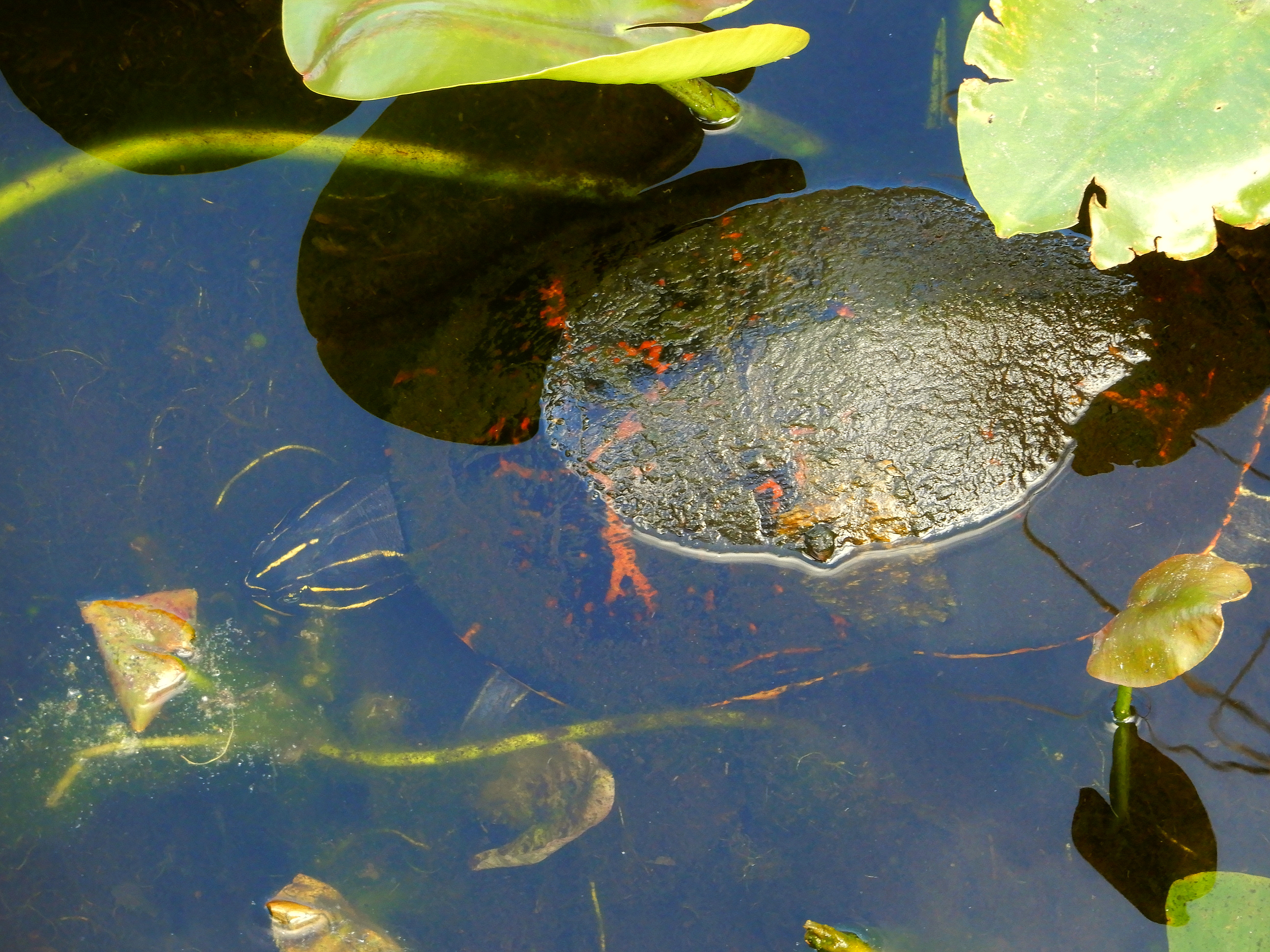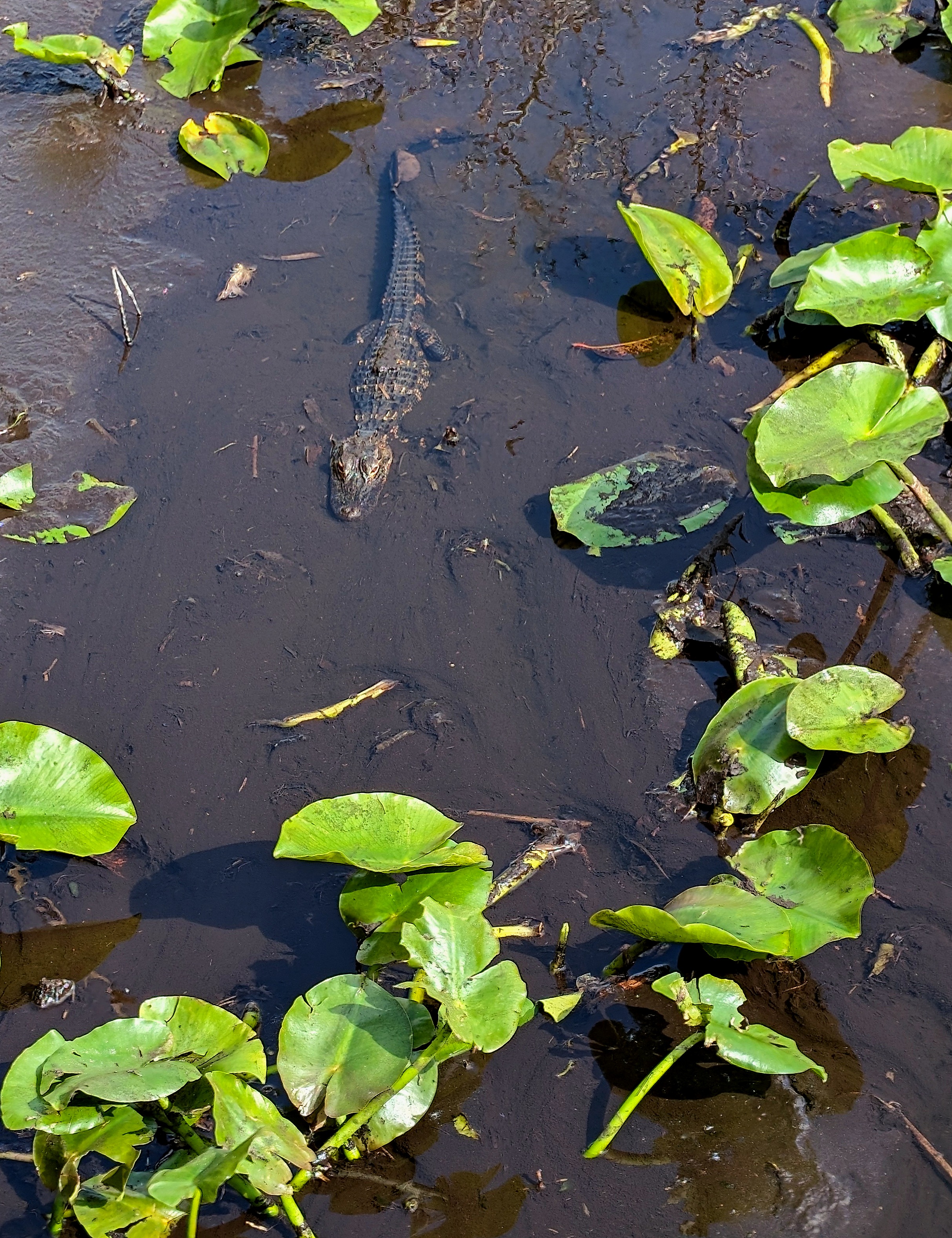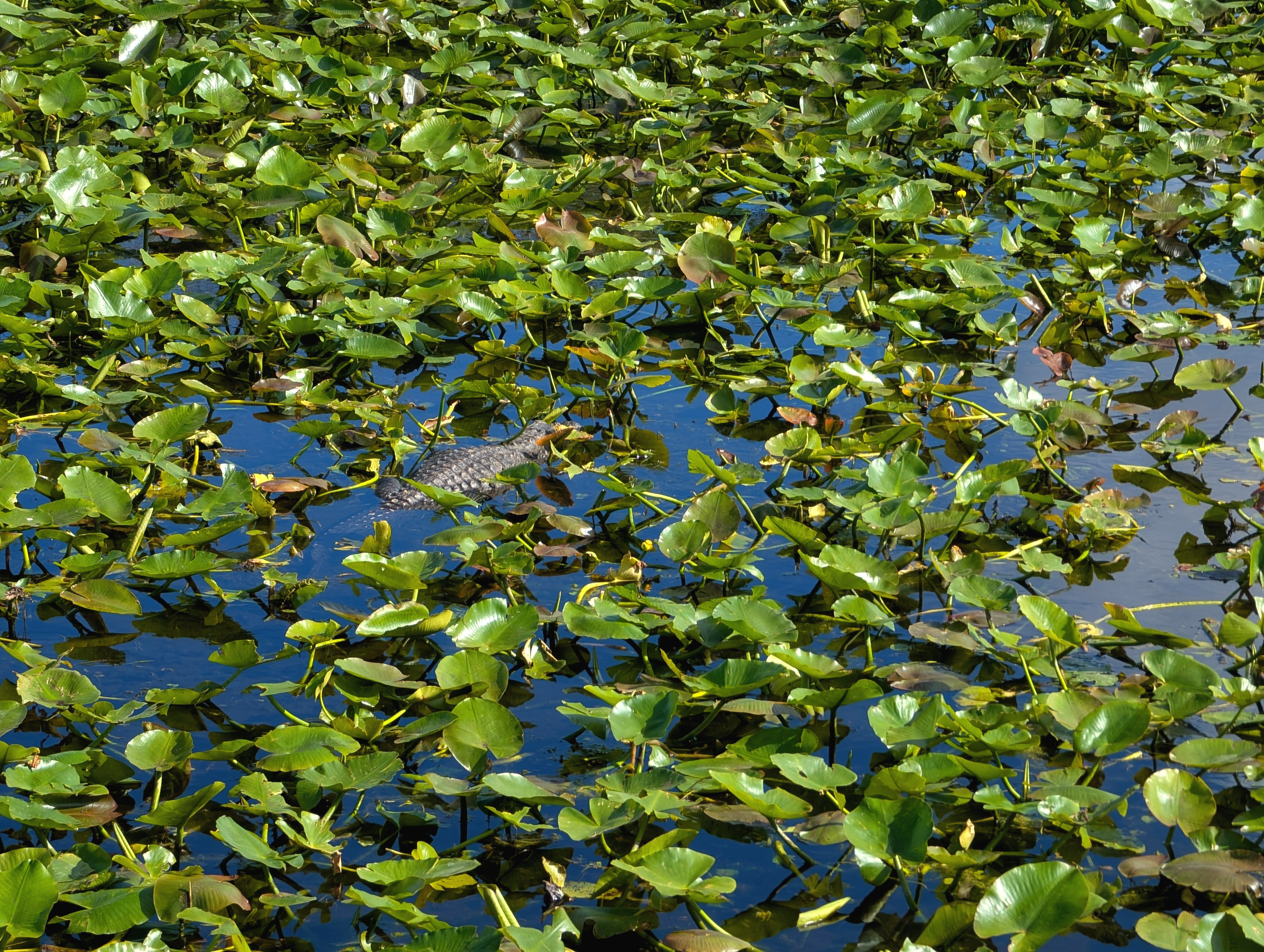 In the center of the walk visitors can access several viewpoints around a large, lily pad-choked pond. Surveying the pond, one can pick out alligators here and there…