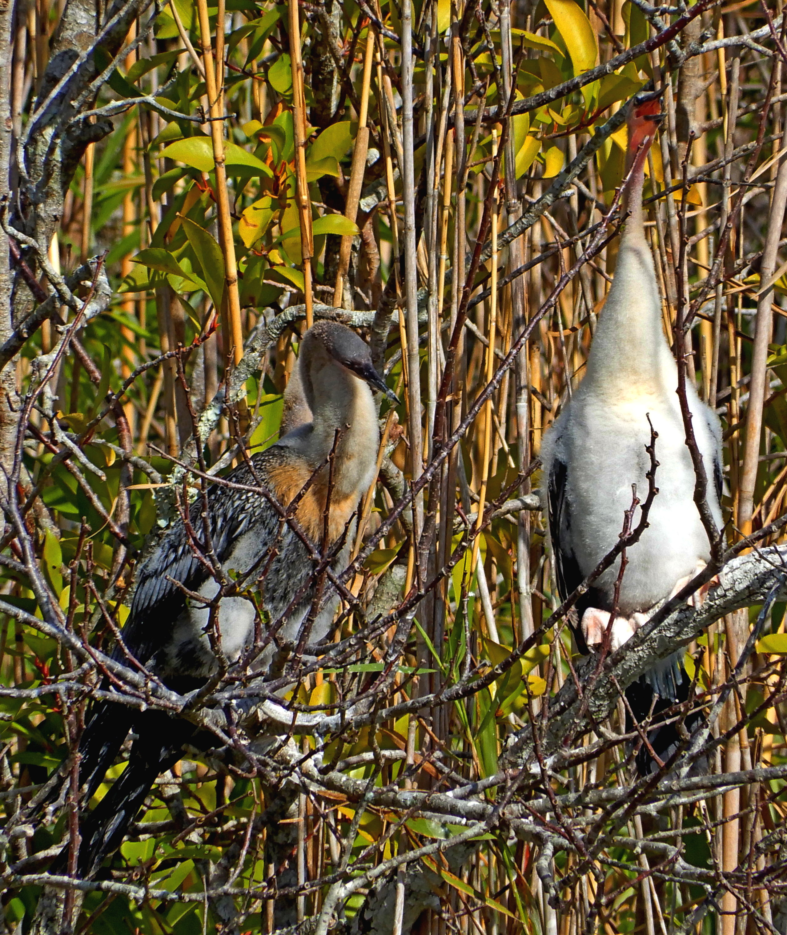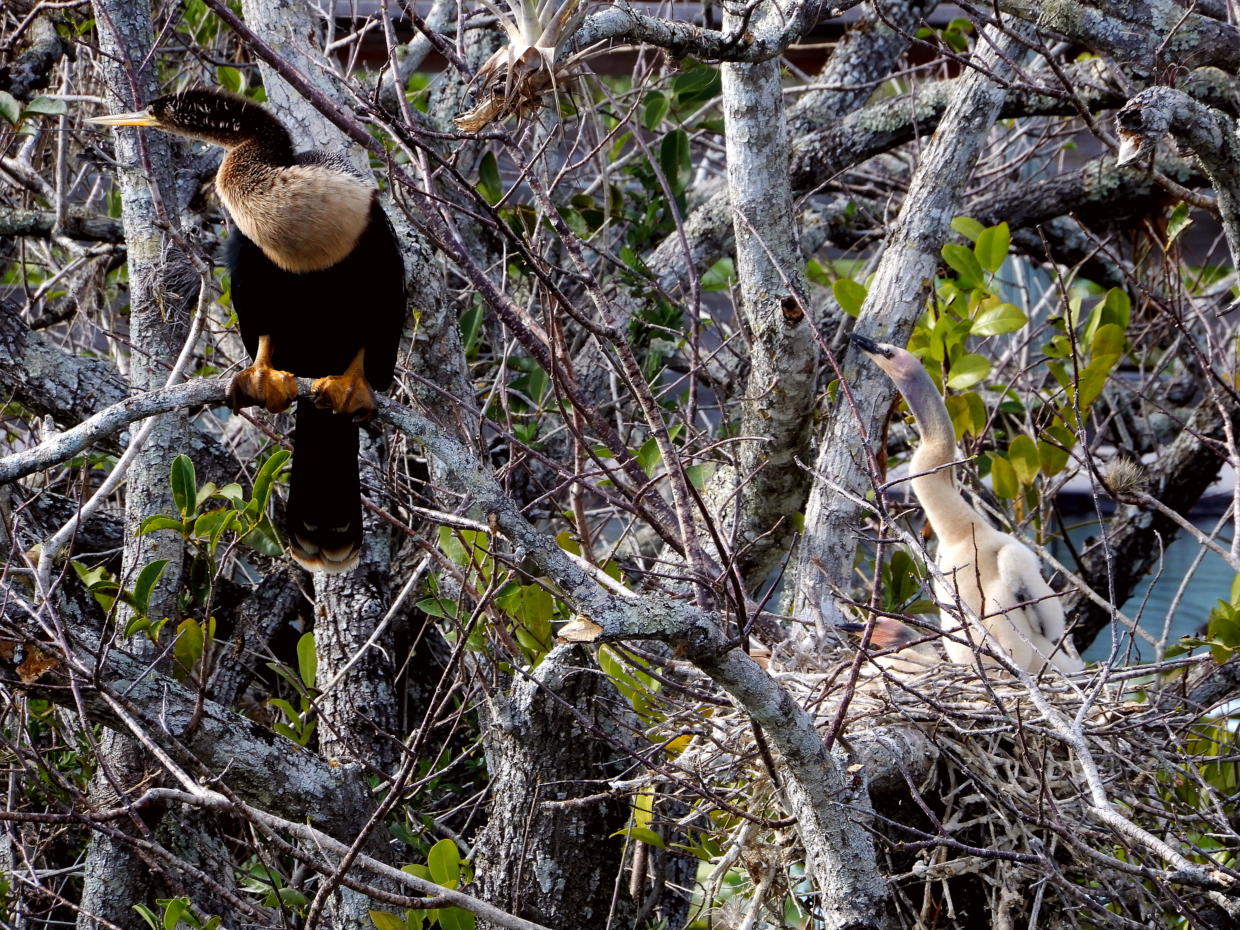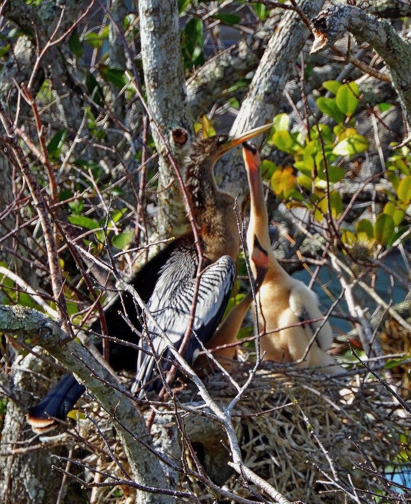 One benefits in several ways when a visit to the Everglades occurs in the so-called winter months. It’s usually warm enough for shirt sleeves; mosquitoes have disappeared; manatees congregate in the warmer waters near the shore where people can see them (sorry, no good photos of those, I’m afraid); and in late February and March young fledglings have been born. This striking set of shots caught me by surprise. I’ve never seen a family of Anhingas before. Frustratingly, they were located across the pond and partially hidden in the branches of the trees. I don’t usually publish out-of-focus photos but this old man couldn’t get the shot at that zoom level with no tripod/monopod or grip.