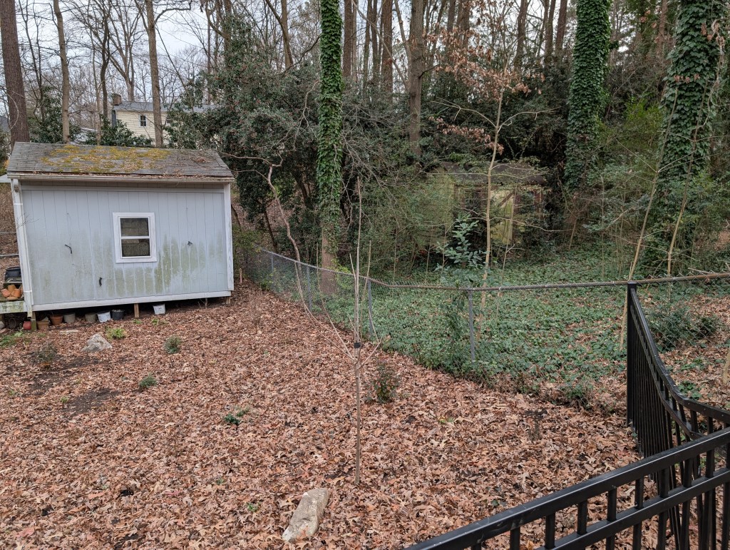 Last October we paid to have our back yard replanted with plants native to North Carolina, the American Southeast, and the Atlantic seaboard. As in colder climes, the vast majority of native plants drop their leaves and enter dormancy for the colder winter months. We also “leave the leaves” which allows them to decompose into the soil as they should, creates cover for the little creatures to stay warm (and avoid hawks), and supports the lives of little bugs which in turn provide food for the ground-feeding birds. Thus, the predominant color of our back yard and our front yard is brown.