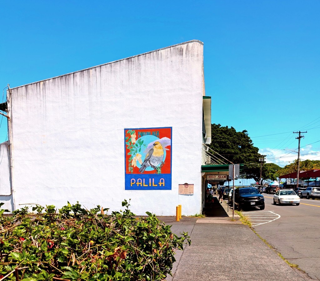 Downtown Hilo looking northeast toward Hilo Bay. Turn left from this position and one is smack dab in front of the KTA Superstore mentioned in the post about our first day on the Big Island. September 2024.Downtown Hilo, nearing the beachfront. In the foreground is Turn the Page, a bookstore. Like many of the merchants, it has no glass in the windows–those openings let the breezes (and birds) into the store. In the background and through the palms one can see the hotels on the peninsulas where our hotel stands. September 2024.