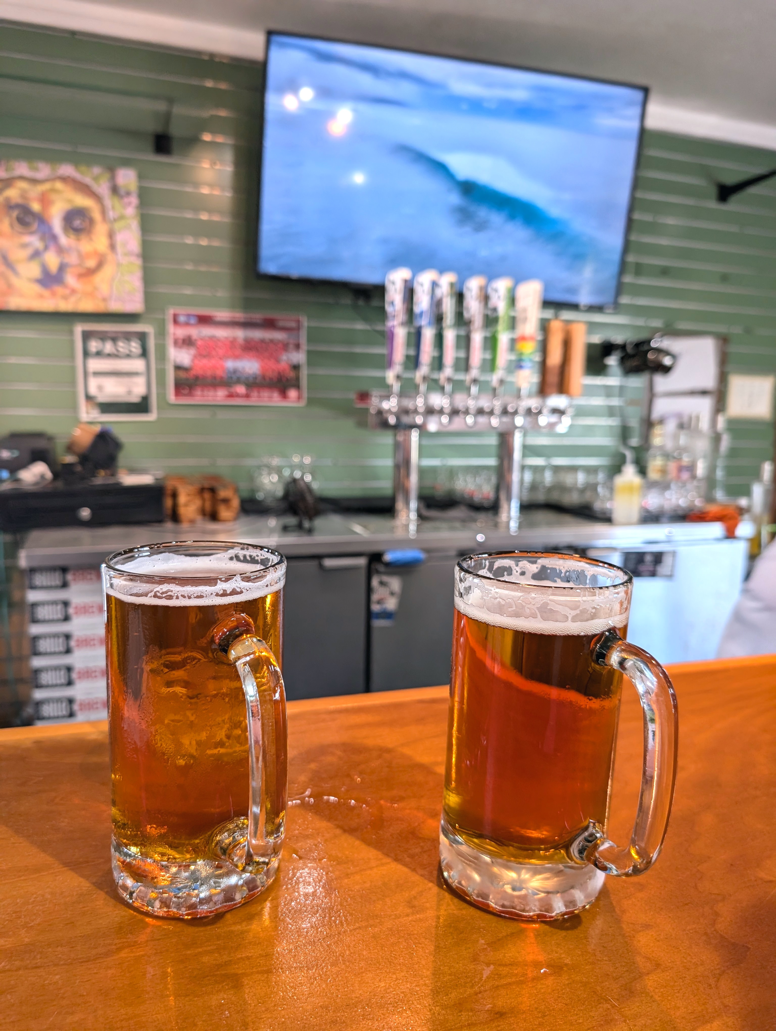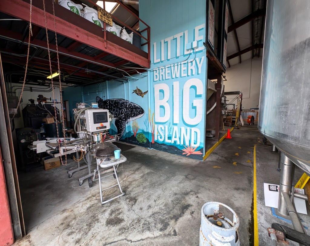 On the way to the restroom, aided by yellow footprints painted on the concrete and surrounded by brewing accoutrement. I’m sure this is up to code, right? Right? Hilo, HI, September 2024.A short wooden bar seating about six to eight. Surf documentary on the TV. Eight taps, several of which were tapped out. Through the open rollup door we gazed at other patrons talking and laughing at picnic tables. The brewer sits in a mixed industrial area. Think cyclone fences, cracked pavement with grasses growing in them, a kind of Quonset Chic vibe. Hilo, HI, September 2024.