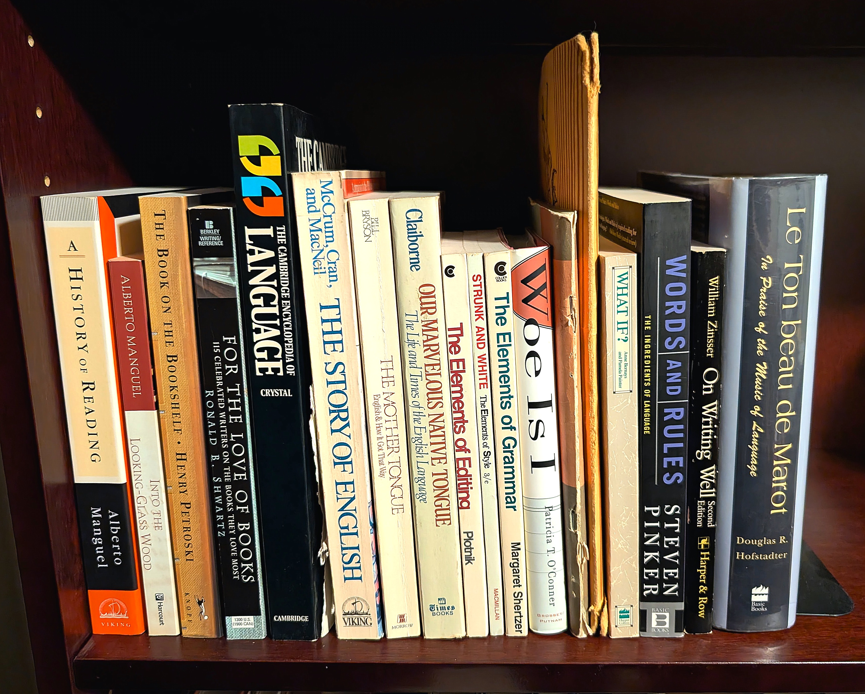 Despite having degrees in both Communications and English, I possess a scant half-shelf of books about the language I use. Perhaps this relates to the Communications degree carrying a focus of journalism and the latter one a focus on literature. The English degree also had a few courses pared from it because of the additional classes I had to take to get the “.Ed” added to the end of it. Linguistics interested me until I encountered the arguments for Noam Chomsky’s innate grammar versus the classic thought that grammar remains culturally induced. I suppose this means something important to someone, but who really cares right now? All books I bought for linguistics possessed such rarified, dry prose to make them insufferable the moment I finished the class which required their purchase.