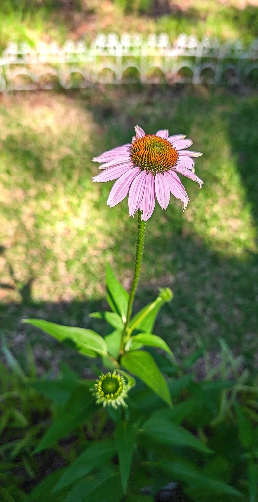 First purple coneflower of the season. Not very purple, but just bloomed out today. All flowers are doing well due to mild weather with just the right amount of moisture. May 2024.