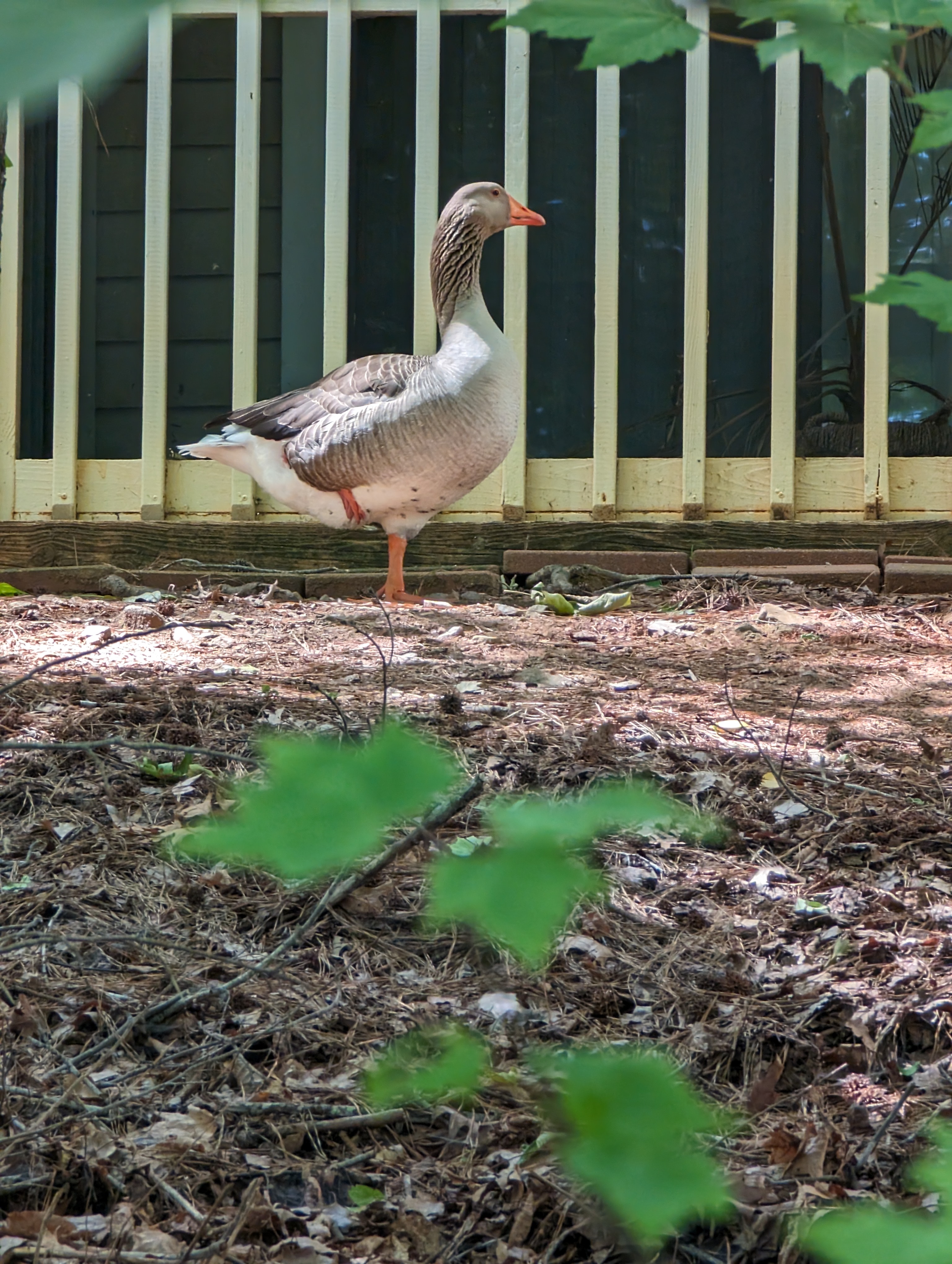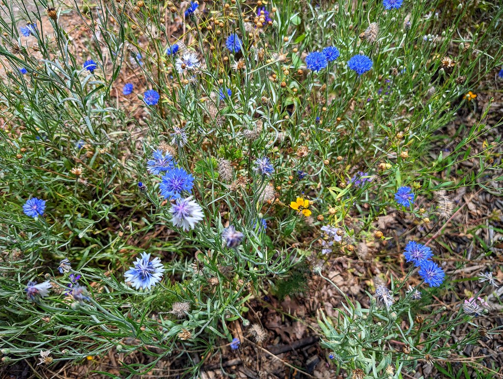 One of two geese of this species we see frequently. This one stands one-legged up the slope from the lake near an apartment in the many buildings which ring the lake. Lake Lynn, Raleigh, NC. June 2024.The Lake Lynn southern parking lot has a small butterfly/pollinator bed including these Bachelor Buttons. Lake Lynn, Raleigh, NC. June 2024.In the butterfly/pollinator garden Black-eyed Susans predominate. Lake Lynn, Raleigh, NC. June 2024.