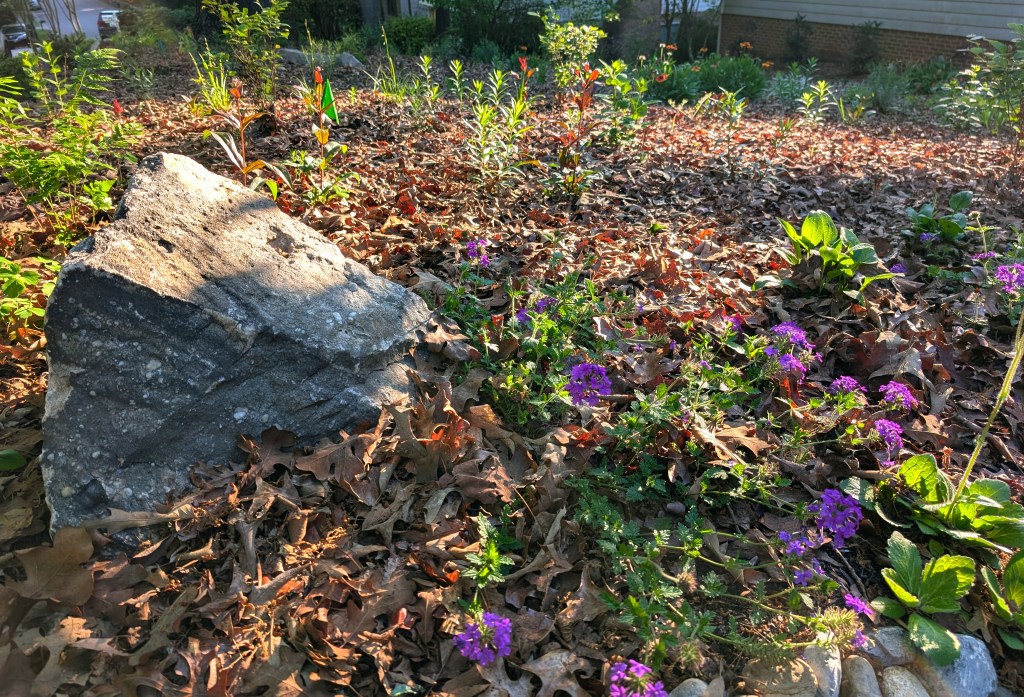 Our front yard, six months after its installation. Raleigh, NC. April 2025.Mock vervain (I think) on the left, Robin’s plantain on the right (a cultivar of fleabane). Raleigh, NC. April 2025.