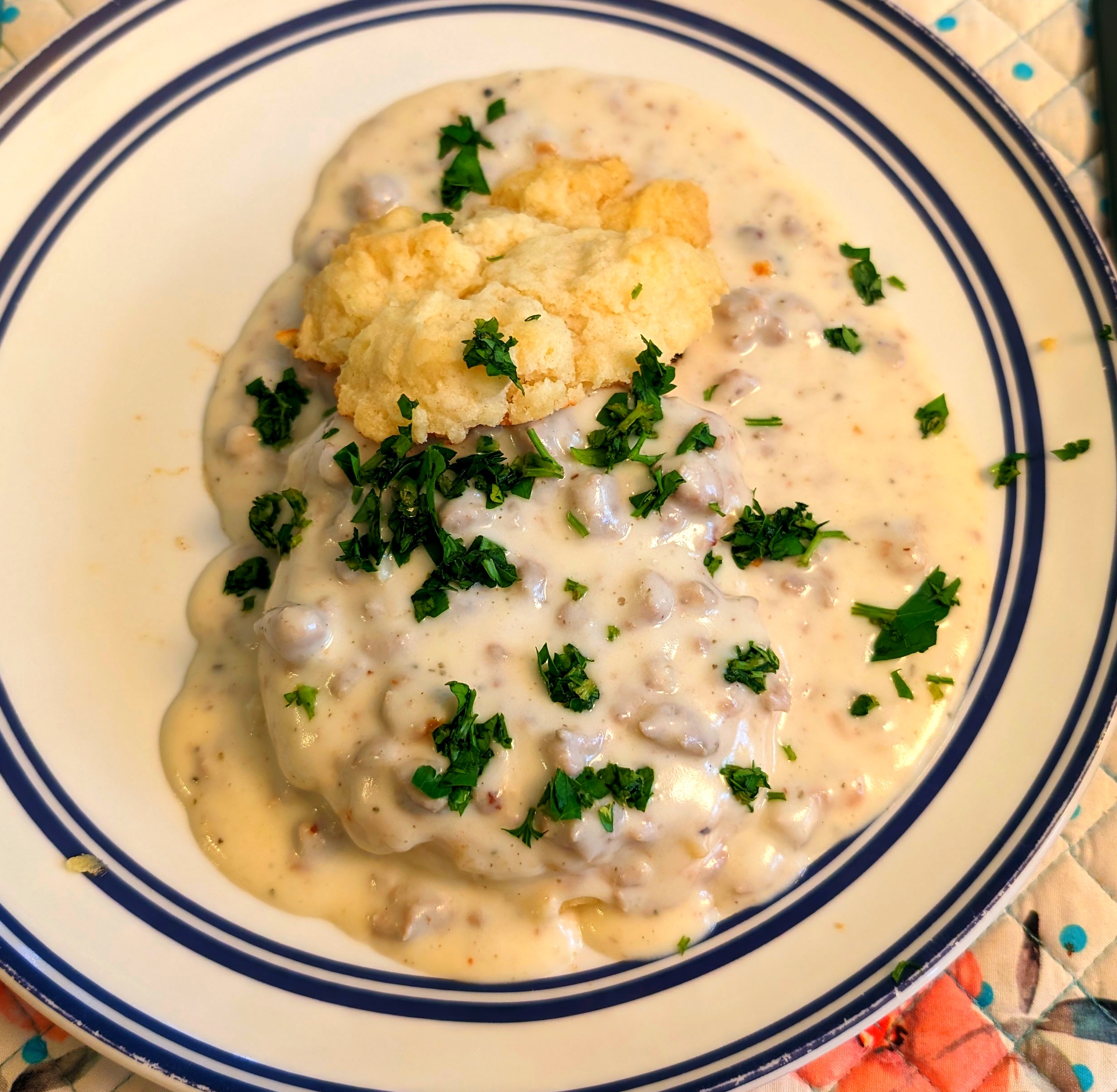 Buttermilk Kitchen’s Sawmill Gravy on O.G. Biscuits. March 2024.