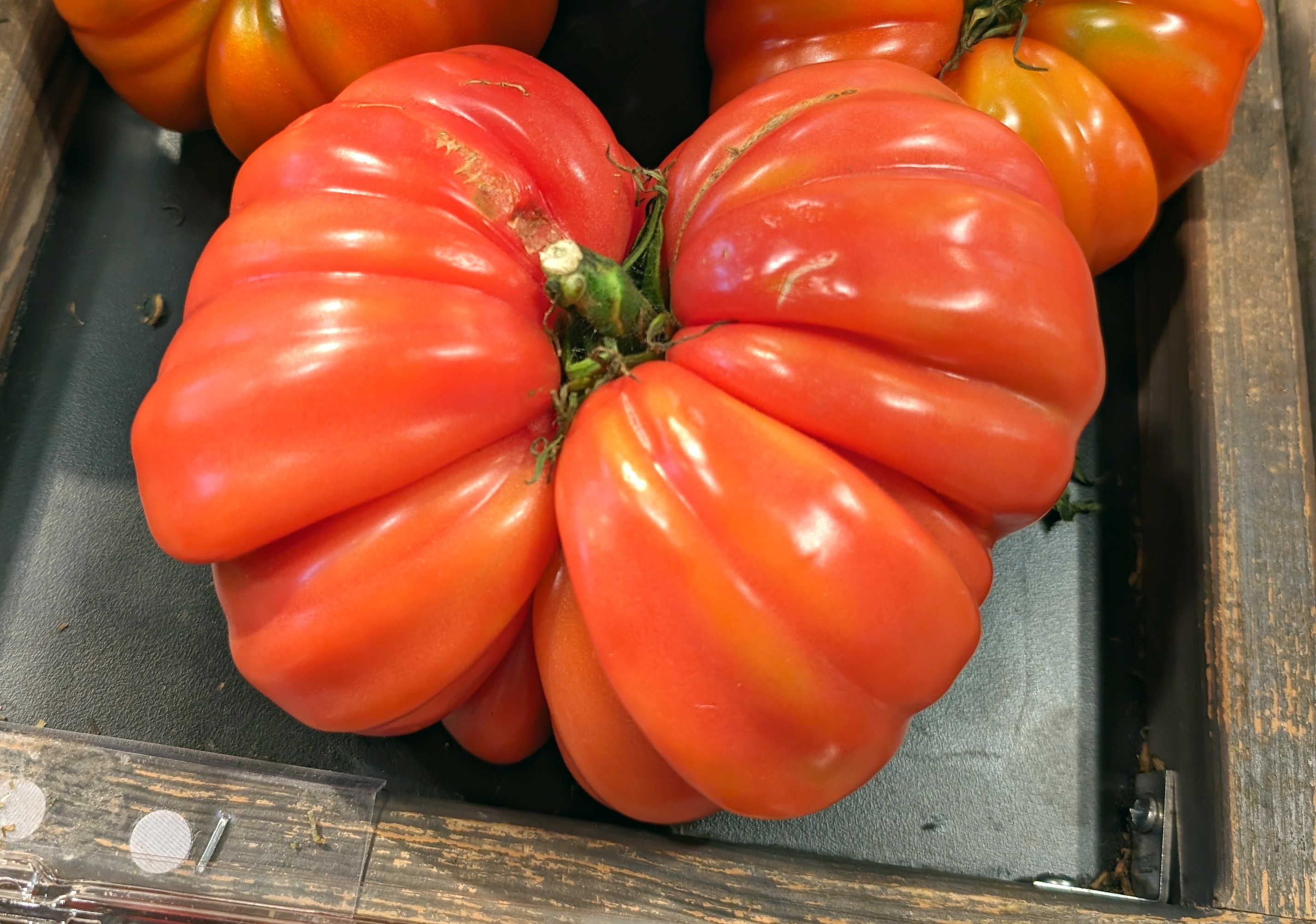I shop produce first, even when the store doesn’t shunt me there with its layout. Friday, barely into the nearest Whole Foods, I spotted this heirloom tomato, all 2.25 pounds of it. I wandered the store getting things for the list, but couldn’t shake the idea of thing. I texted my wife and a couple friends about it, and they said, “buy it!” For scale, I can just comfortably get one hand around each half; it takes two hands to hold it. It looks like conjoined twins–I guess it’s offensive now to use the older, more common name. A bit hard–we’ll give it a few days to ripen up and then what? My wife’s vote is for stuffing it. I was thinking a stupendous, feeds-a-family-of-four Caprese salad.