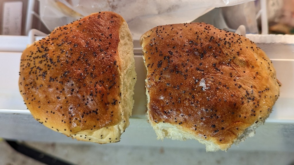 Poppy rolls from the book From Scratch by Michael Ruhlman, baked in a cast iron skillet. They held lots of shredded pork and coleslaw and were dressed with Lexington BBQ sauce. May 2023.Hearth bread from The Bread Bible by Rose Levy Beranbaum. May 2023.