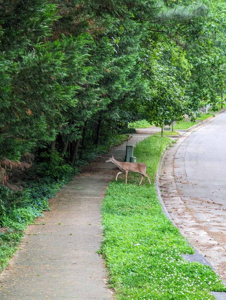 Deer crossing where the City of Raleigh has built a drainage pipe under the road just north of our house by a couple hundred yards. This allows an unnamed creek to flow to Haresnipe Creek. May 2023.