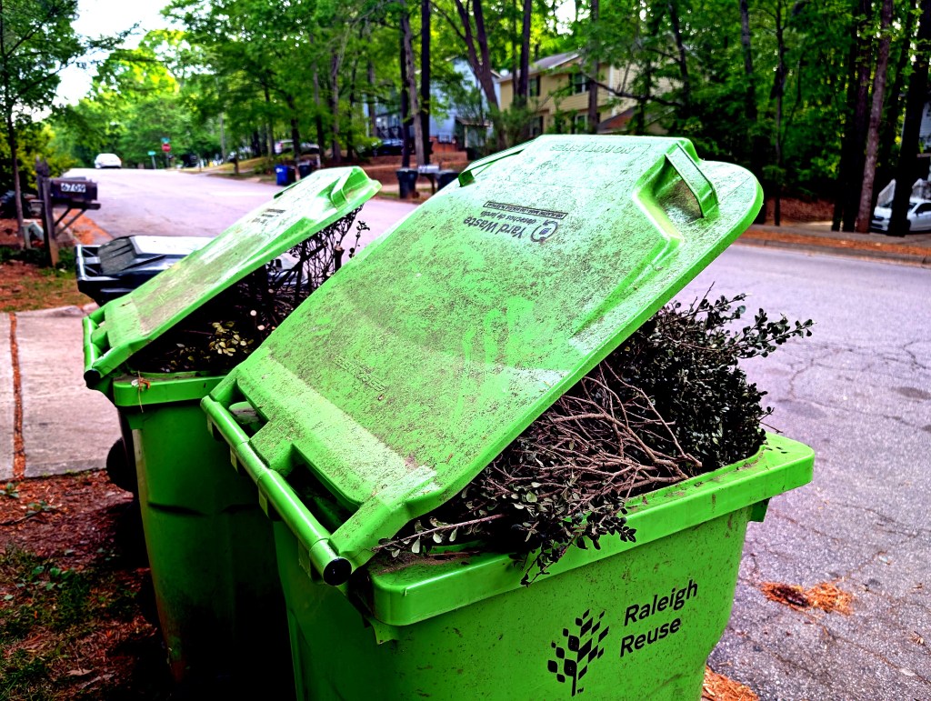 Overfull yard waste containers. Raleigh, NC. April 2025.