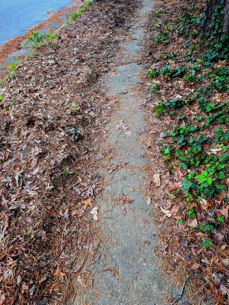 Circling at the block’s end, I encounter my across-the-street neighbor’s sidewalk. Older than me, quite likely in his 80’s, he maintains his large corner lot minimally. Those of us who pass make our own paths through the accumulation of leaves he does not clear: