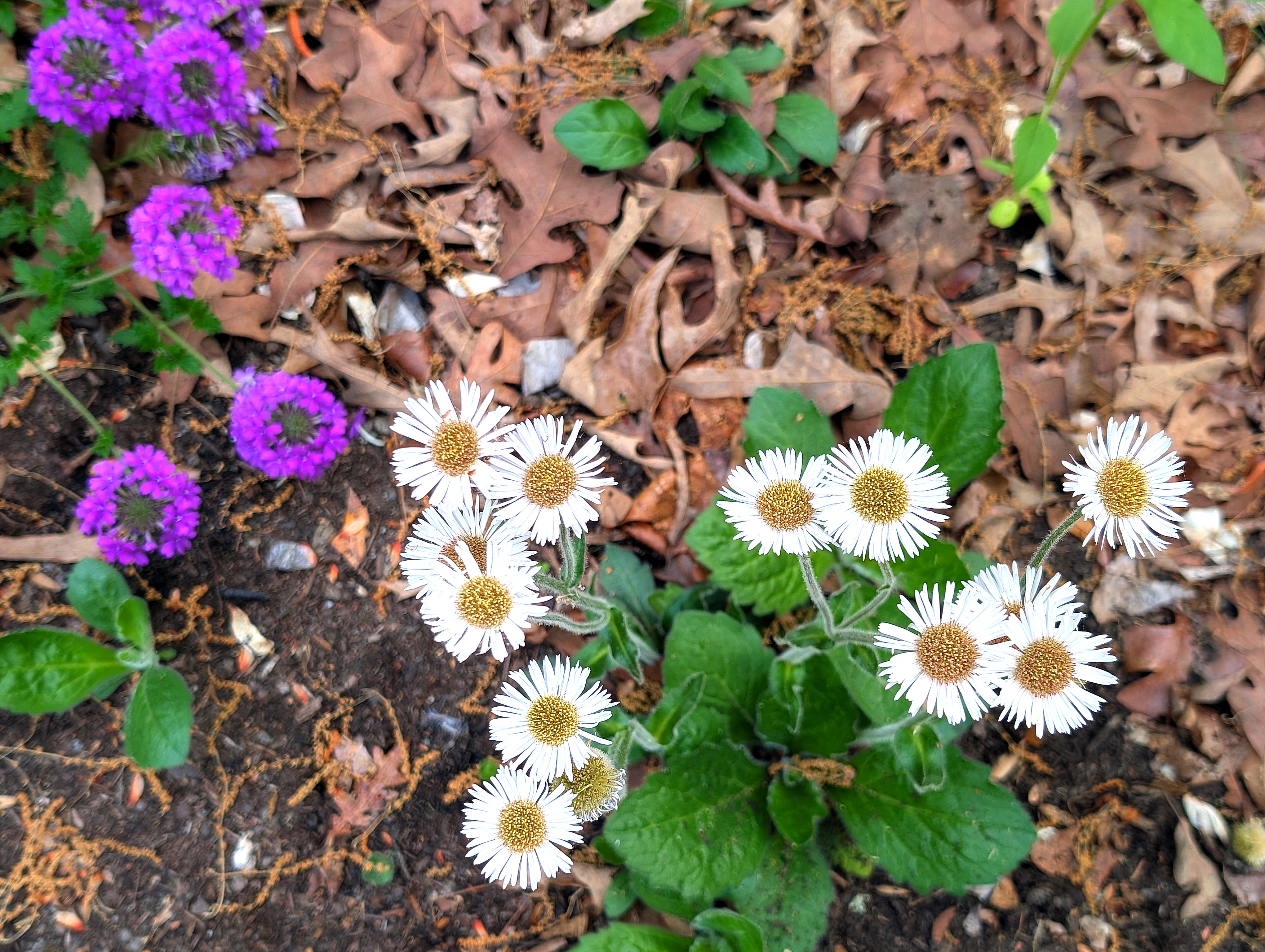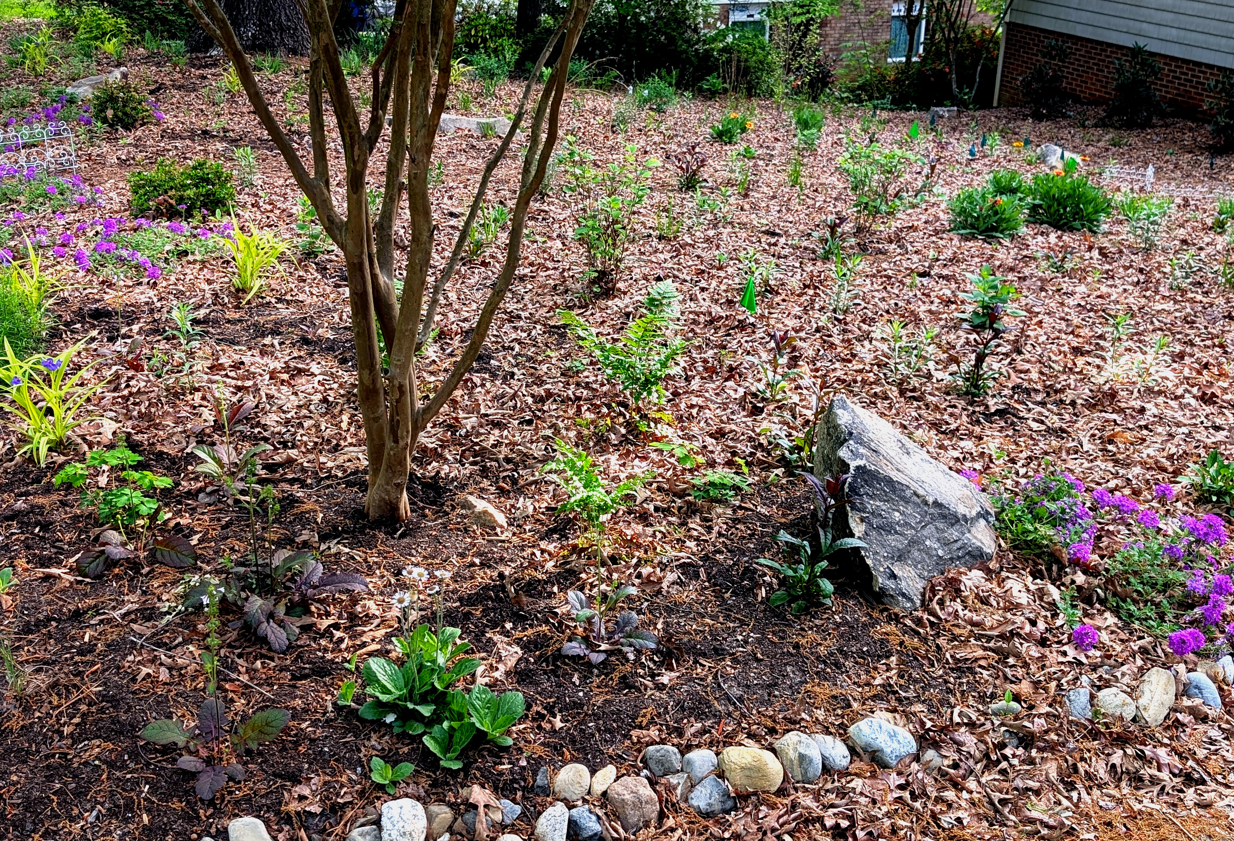 Our front yard, six months after its installation. Raleigh, NC. April 2025.Mock vervain (I think) on the left, Robin’s plantain on the right (a cultivar of fleabane). Raleigh, NC. April 2025.