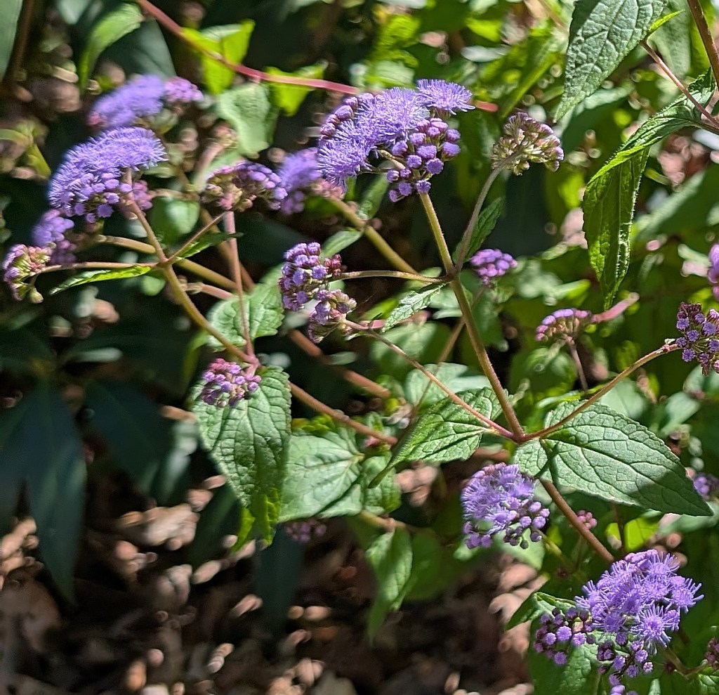 This bank of blue mistflowers looked reasonably modest in size when we left for Europe on August 7, 2025. They’ve now taken over this segment of the yard, overwhelming several plants underneath them. September 2025.Detail from a much larger photo of another bank of the blue mistflowers, showing how small flowers form much larger clusters. This photo is unretouched except for a slight amount of sharpening I added to see the flower petals better. September 2025.