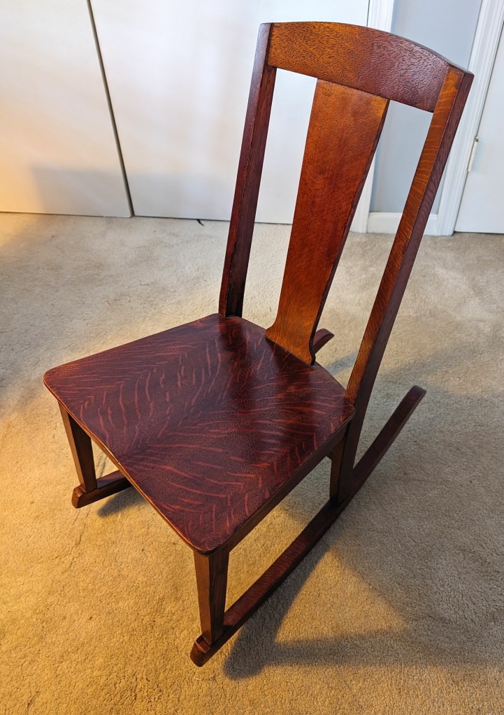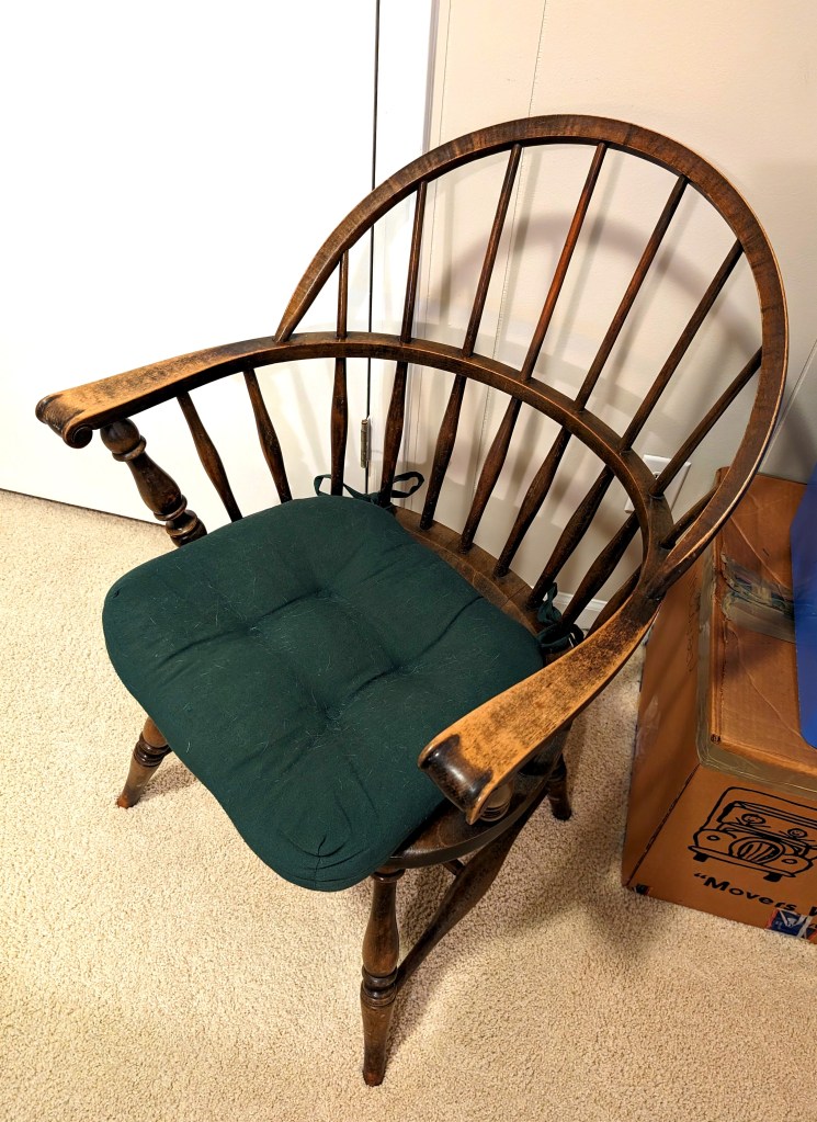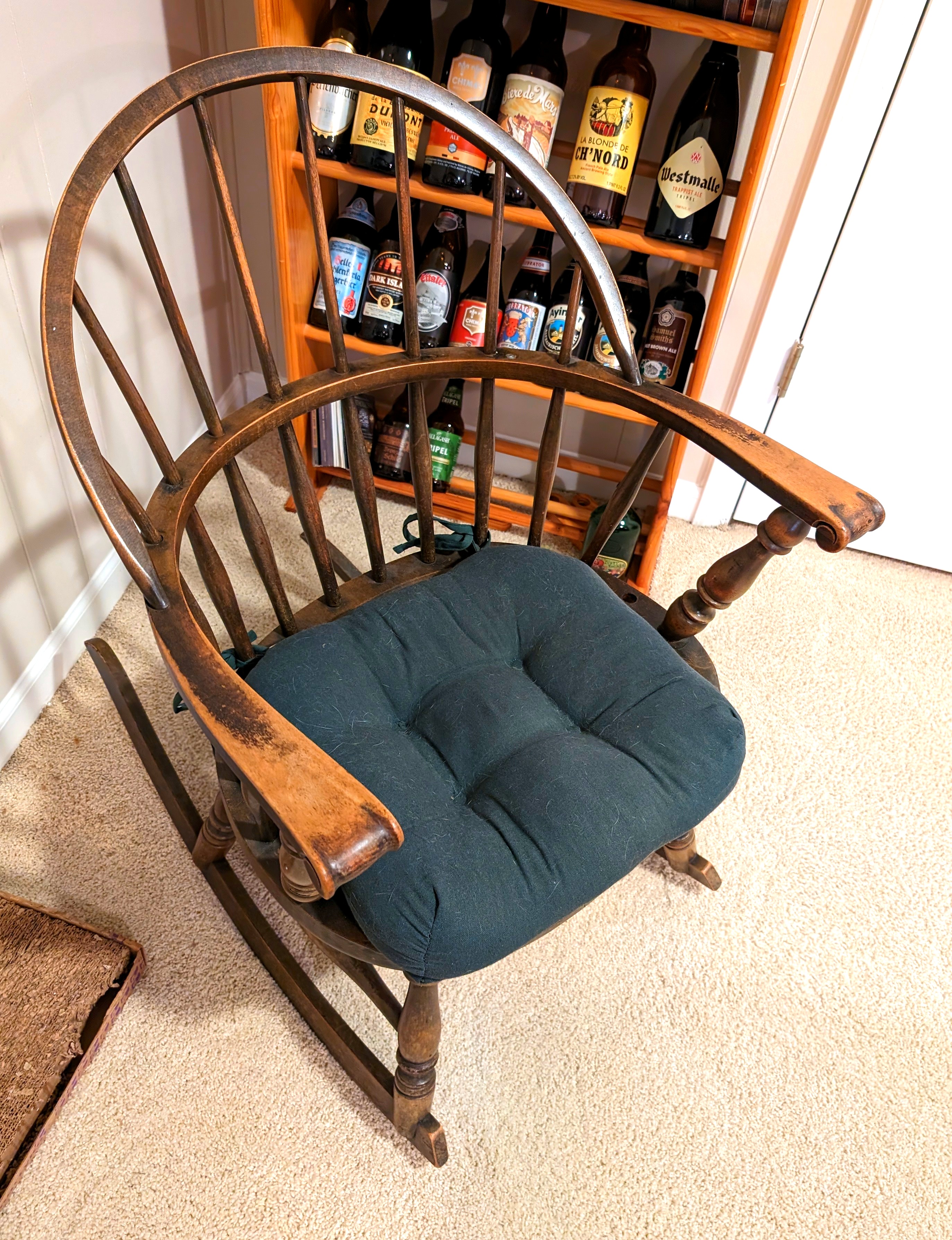 When my father’s father died, and his mother entered a nursing home, I inherited another rocker and its matching straight-legged chair, a captain’s chair style. I wish I could remember their position in their household. These two must have had either sentimental or practical value for my grandparents to have moved them from a large Victorian three-bedroom house to a small two-bedroom home in a retirement community. The rocker is missing one of the dowels between the seat and the arms. My father’s brother got his leg stuck between two dowels and my panicking grandmother insisted to her husband that they break out one dowel to free him.