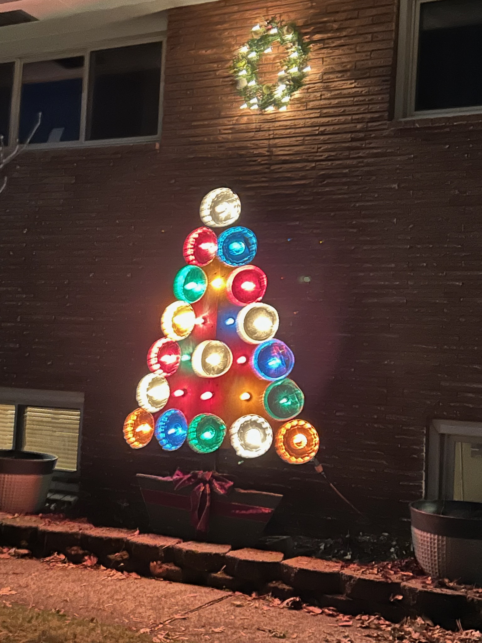 My parents’ neighbor’s resurrected Christmas tree decoration. Christmas 2023. [Photo by current owner of the house.]