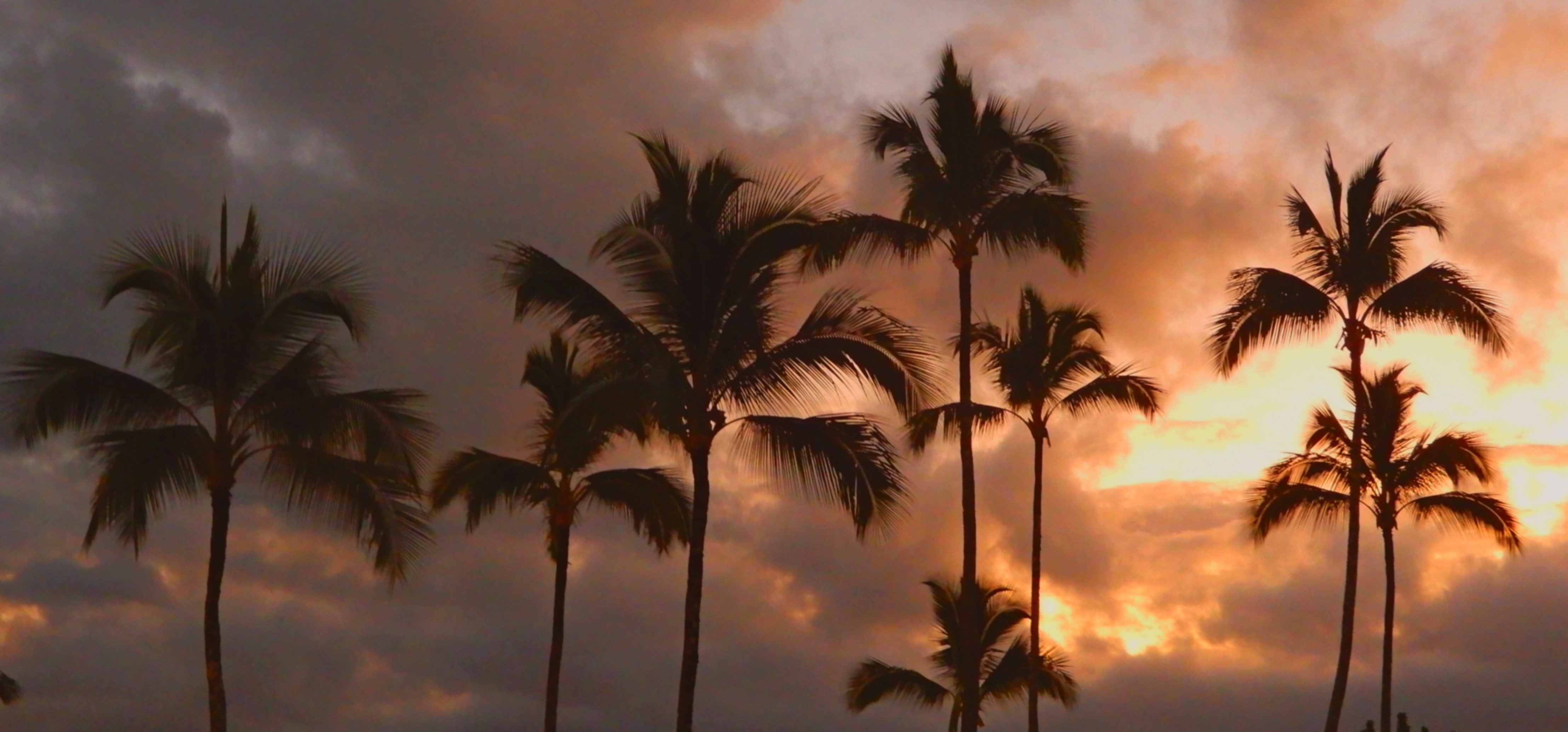Palms over Hilo Bay at sunset. Hilo, HI, September 2024.
